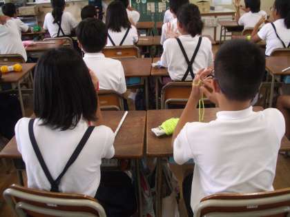 家庭科でアクリルタワシの“手編み”に挑戦しています。