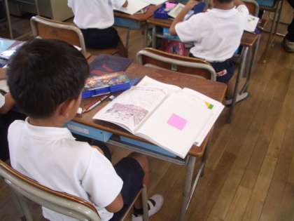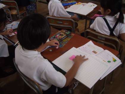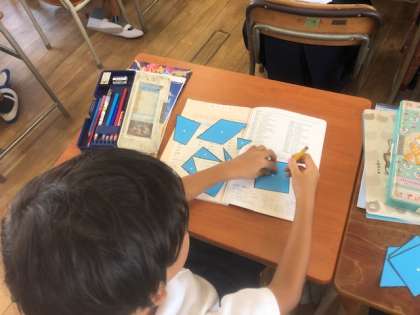 2年生の算数では、教科書に付いている三角形を使ったり、折り紙を使ったりしていろいろな形を学習しています。