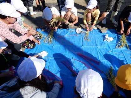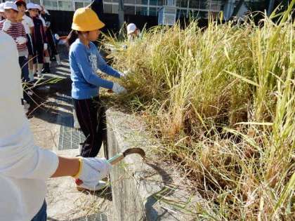 10月18日(土) 学校公開、土曜参観の今日、5年生が1時間目から稲刈りに挑みました。春に田植えをしておよそ、5ヵ月。たわわに実った稲穂を刈り取りながら、秋の収穫の喜びを感じているようでした。