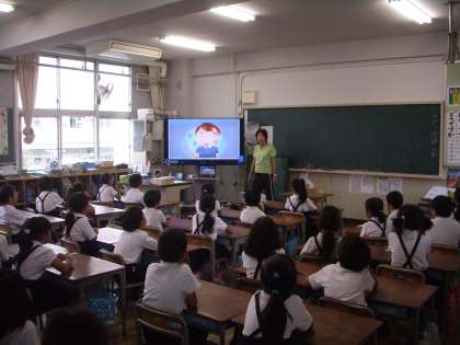 子どもたちはDVDの英語に合わせて、ほとんど同じ速さで英語を発音している子どもたちもいます。