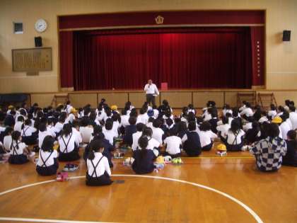スマイル集会の後、校長先生から明日10月18日の50回目の創立記念日についてのお話がありました。