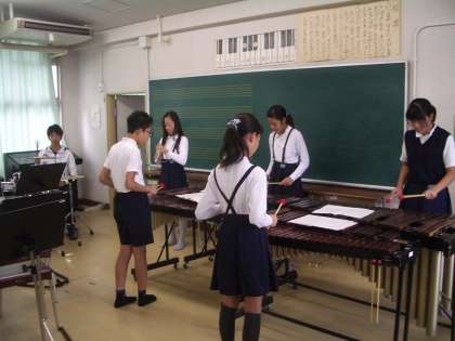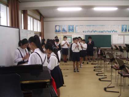 6年生は音楽室で、唱歌「ふるさと」の合奏練習をしています。