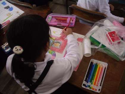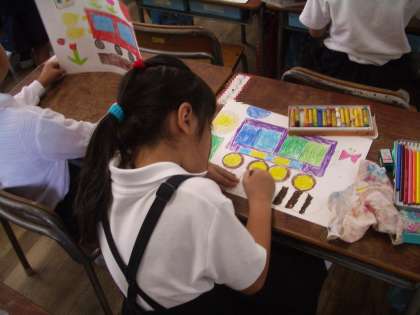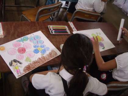 “いろんなかたちをうつそう”ということで、いろんな形をっ使って絵をかき、色を塗りました。