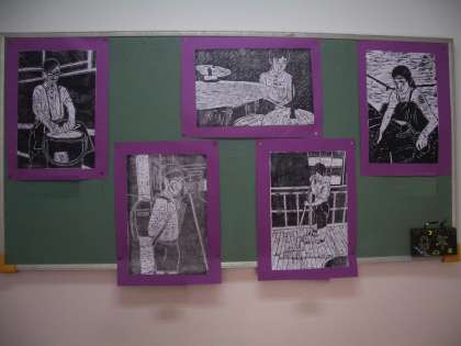 10月24日(木) 6年生の階段掲示は、版画“〇〇しているわたし”です。