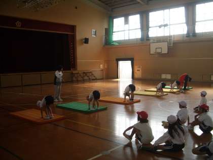 1年がマット運動をしています。前転はスムーズにできるようになってきました。
