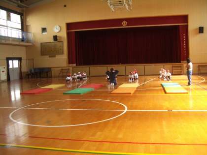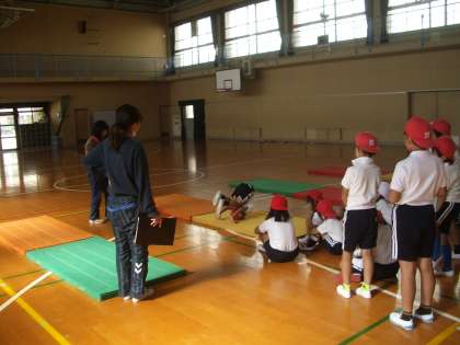 2年生がマット運動(前転)をしています。