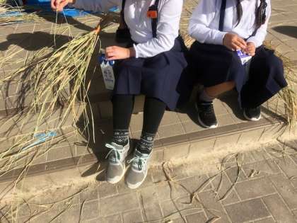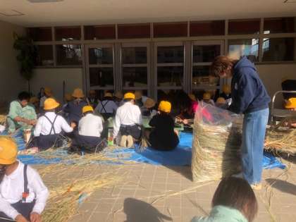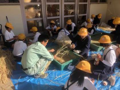 5年生の今回の脱穀作業は、脱穀機を使わずに牛乳パックを使いました。