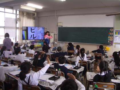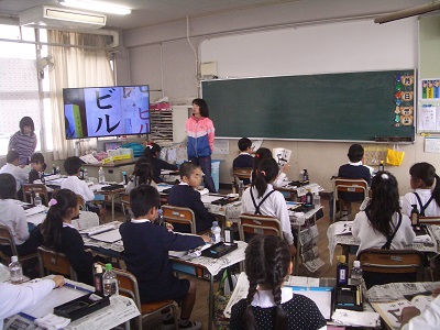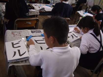 道具の置き方をていねいに確認したのち、いっしょに筆順を確かめ、それから各自書で書き始めています。