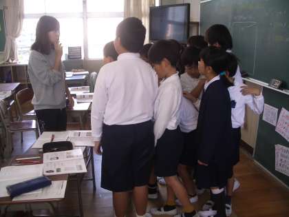 4年生の算数では、1平方メートルの段ボールの上に何人かで乗って大きさを実感しています。
