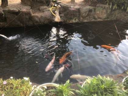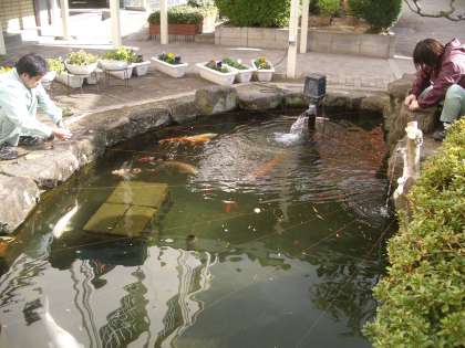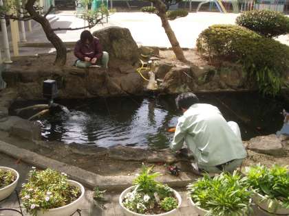 鯉を鳥から守るために本校の管理作業員が糸を張り巡らせています。