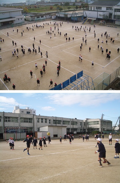 校庭に5つのコートを書き、スマイル班対抗でドッジボールをしました。