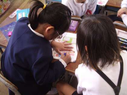 勝った方が色鉛筆で四角のマスに自分の色を塗り、最後にどちらの陣地が広いかを確かめました。