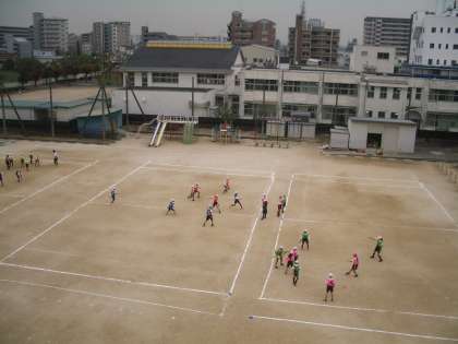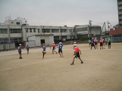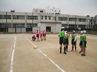 6年生は練習の段階から実戦に移っています。途中で作戦タイムを取るなど、チームで工夫しながらゲームを進めています。
