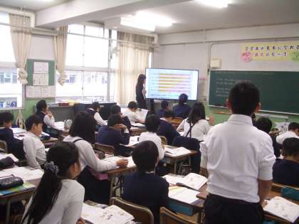 5年生が社会で、グラフから“重工業と軽工業”と“大工場と中小工場”の関係について学んでいます。