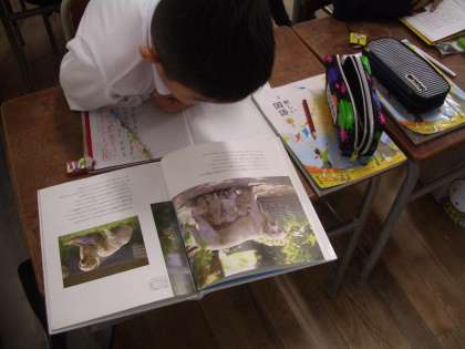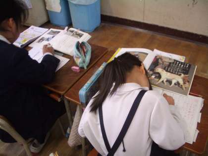 3年生が、盲導犬以外の“はたらく犬”についてリーフレットを書くための資料を集めています。
