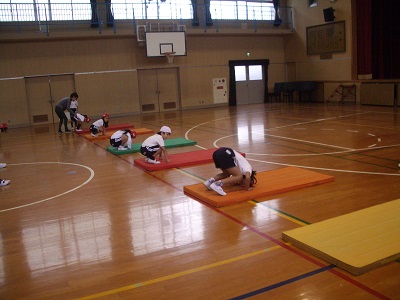 1年生のマット運動では安全に配慮し、またうまく回転できるように一人ひとりの動きを確認しています。