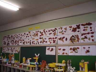 1年生が落ち葉をいろいろなものに見立てて画用紙に貼りました。