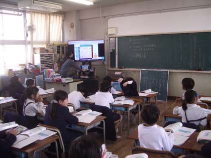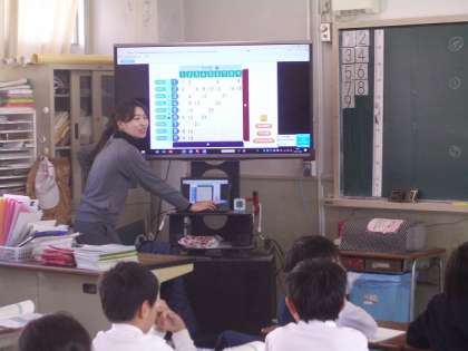 2年生が“かけ算表”を使って、かけ算のきまりについて考えています。