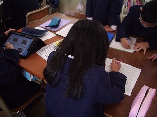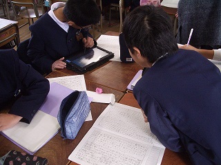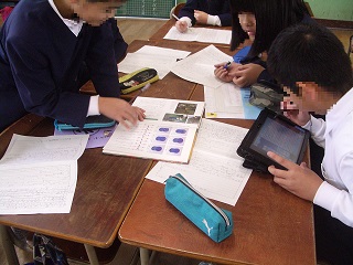 5年生は、タブレット等を使って調べた“和の文化”について、発表を前にして班でまとめています。