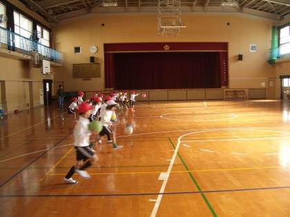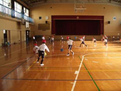 1年生が体育館でドリブル競走をしました。