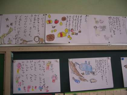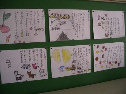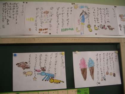 「わんわん いぬ」「ぴょんぴょん うさぎ」・・・1年生は言葉遊びを楽しみ、言葉と一緒に絵も描いて教室に掲示しました。