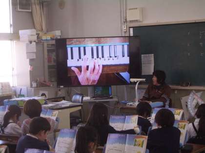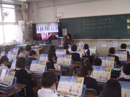 大型テレビでの模範演奏を見て、子どもたちが鍵盤ハーモニカの練習をしています。