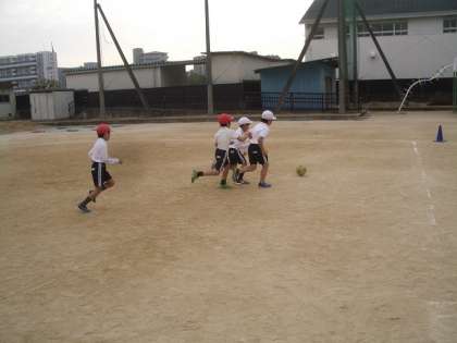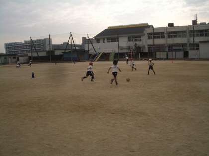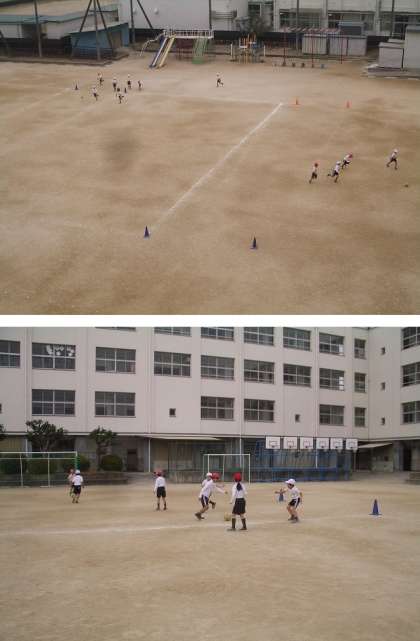 2年生の体育では、子どもたちがボールをけって広い運動場をかけ回っています。