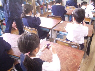 1年生が駒に色付けをした後、1階に下りて駒回しをしました。