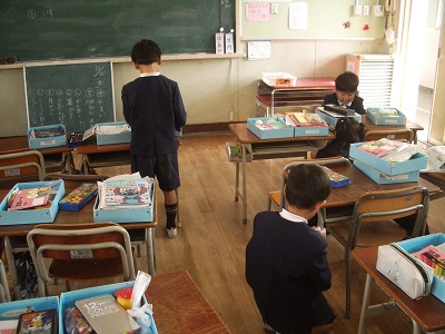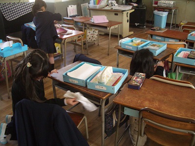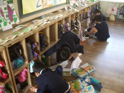 自分の机やロッカーの中をきれいに整理し、雑巾でていねいにふいています。