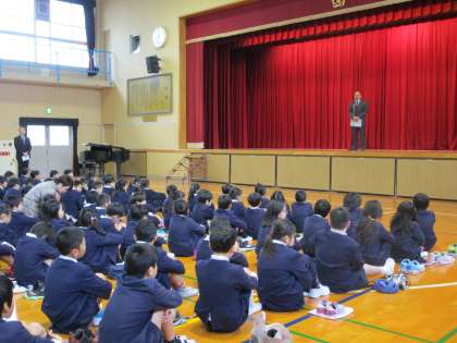 校長先生から長原小学校の校訓“強く・正しく・明るく”についてのお話がありました。