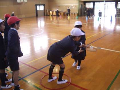 今日のスマイル集会は、“バトミントンの羽運びリレー”でした。