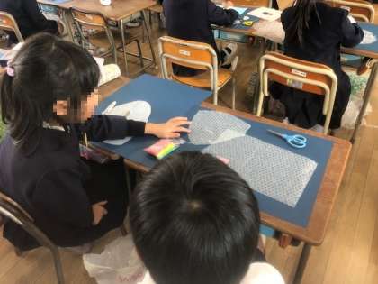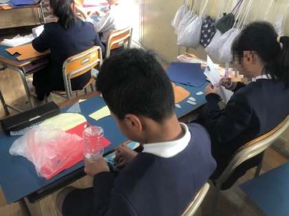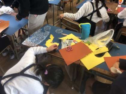3年生が色画用紙といろんな素材を使って工作をしています。