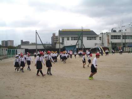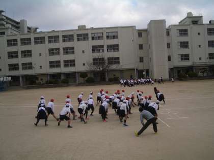 走り出す前に全校児童で声を出しながら準備運動をします。