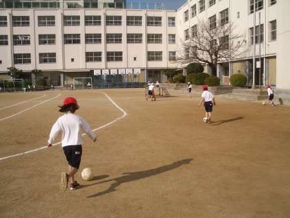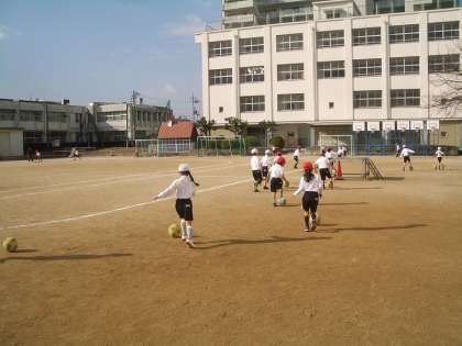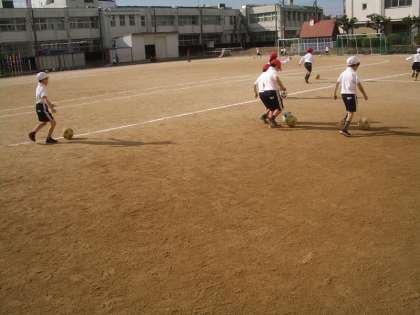 1年生の子どもたちが、サッカーボールをけりながらトラックの周りを走っています。