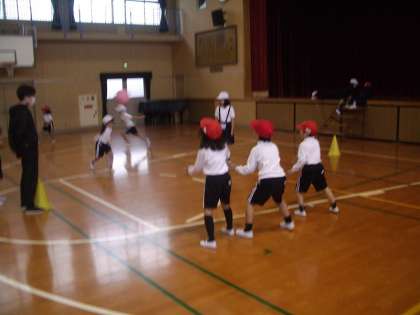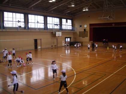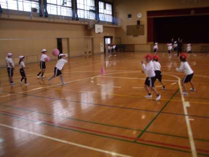 1年生の体育では、体育館で2面のコートを使ってドッジボールをしました。
