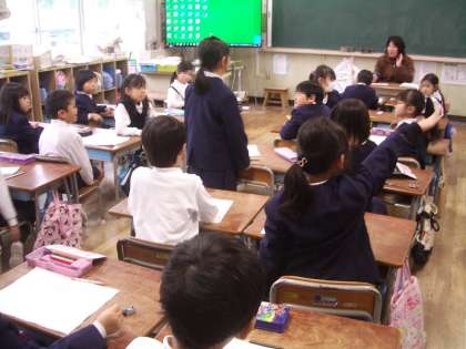 1年生の国語の時間に子どもたちが“むかしばなし”を作って交換し、それを読んだ後の感想を発表しています。