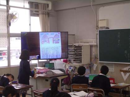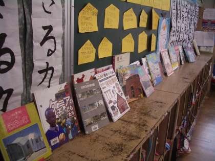 世界各国の家について書かれた本が教室の後ろに置かれています。その中から選んで調べた“家の形”について順番に発表しています。
