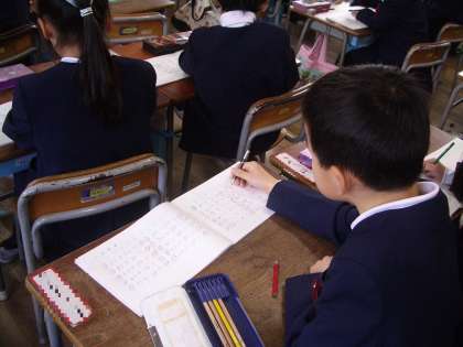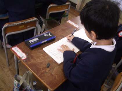 先生黒板に書く問題をノートに写し、問題を解いていきます。