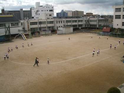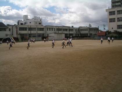 4年生の体育では、子どもたちが運動場を何周も何周も走っていました。