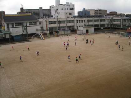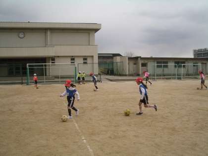 3年生の体育では、サッカーボールを足でキープしながら奪い合いをしていました。