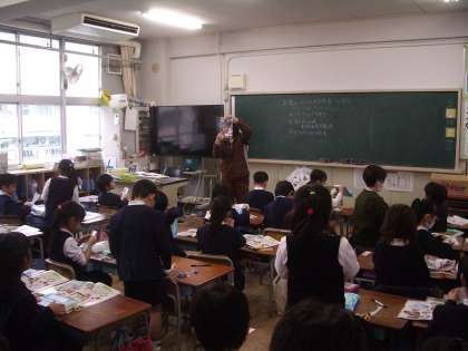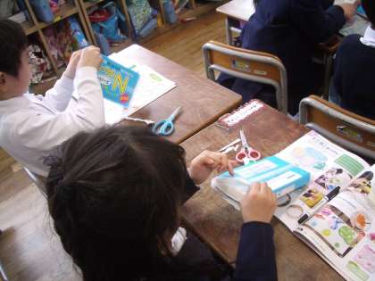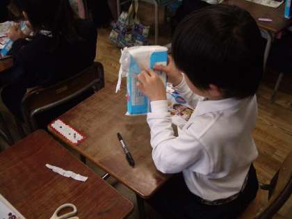 1年生が粘土工作を始める前に袋をはさみで切り、中に入っている粘土を取り出しています。