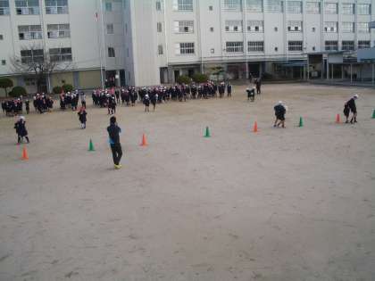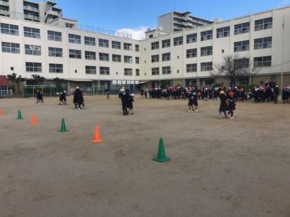 今朝のスマイル集会では。二人で背中にボールをはさんで歩くリレーをしました。