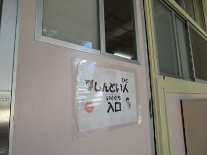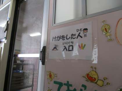 本校では、新型コロナウィルスのの対策として、朝の消毒と休み時間の石鹸での手洗い等をしています。保健室でも、換気をよくするために、網戸を設置し、けがをした人は前の入口から、しんどい人は後ろの入口からというように体のけがや症状によって入室する入口を分けて対応しています。