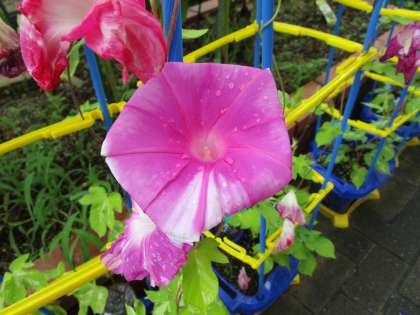 昨夜からの雨で運動場がぬかるんでいたため、今朝の児童朝会は中止。児童が育てている植物も雨でぬれていましたが、1年生が育てているあさがおの花がきれいにさいていました。1時間目、1年生は探検バックを持ってあさがおの観察。児童は自分の育てているあさがおのスケッチをしていました。