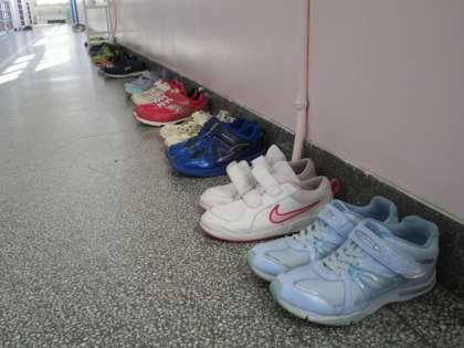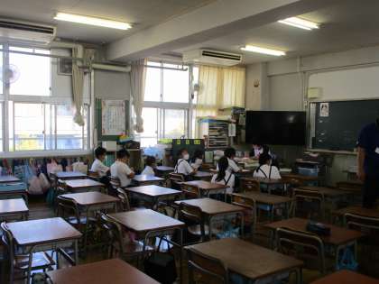 今日は朝から各教室に分かれて縦割り班のスマイル集会がありました。学校にまつわるいろいろなクイズが出題され班ごとに分かれてみんなで考えていました。