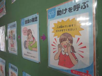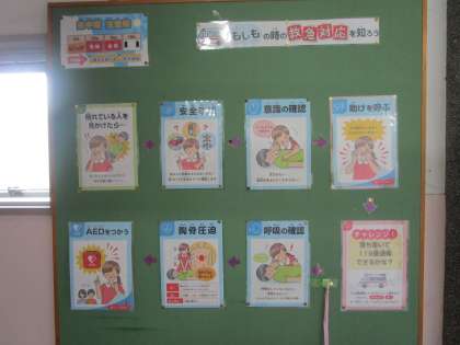 また、保健室前には、「もしもの時の救急対応を知ろう」というタイトルで倒れている人を見かけたらどう対処したらよいかの説明図が掲示されています。