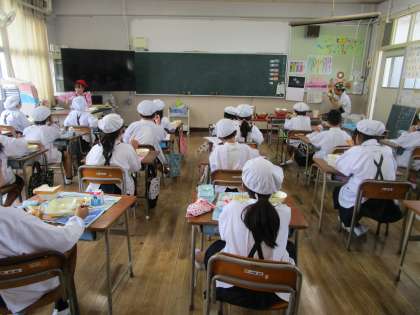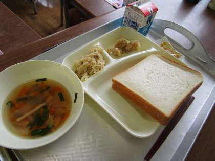 今日の給食の献立は、鶏肉のから揚げ、とうがんの中華スープ、切り干し大根のごま辛みづけでした。児童の大好きなから揚げには、たくさんの児童がおかわりに行っていました。従来の給食時間には机を向かい合わせて班ごとに食べていましたが、今は、全員前を向いて食べています。早く、以前の生活に戻れるようになるといいのですが・・・
