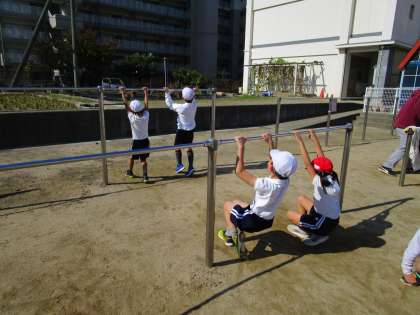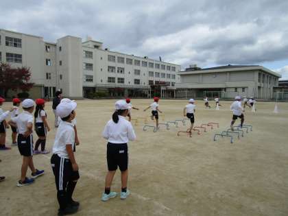 今日は、運動場で2年生の体育の授業がありました。腹筋を鍛え、速く走るための練習として、低いハードルを並べ、手をしっかりと振り、足を上げ素早く走っていました。その後、グループに分かれて逆上がりの練習をしていました。