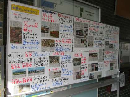 「新聞のしくみを知ろう」ー見出しから興味・関心のある記事を見つけようーと題して校長先生が定期的に玄関に新聞記事を掲示されています。今回は、深まる秋(御在所岳や万博記念公園の紅葉)や立冬(富士山の初冠雪や六甲山の人工雪)、ズワイガニ漁の解禁等の季節を感じる記事や昨年盛り上がったラグビーの記事が掲示されていました。