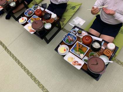 次に、避難訓練を行い、夕食の時間です。おいしそうなごちそうがいっぱい! おなか一杯になりました。